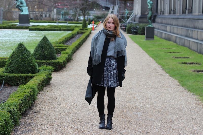 Monki coat / Acne scarf / American Apparel clutch / BZR knit / Samsøe Samsøe skirt / Gardenia boots