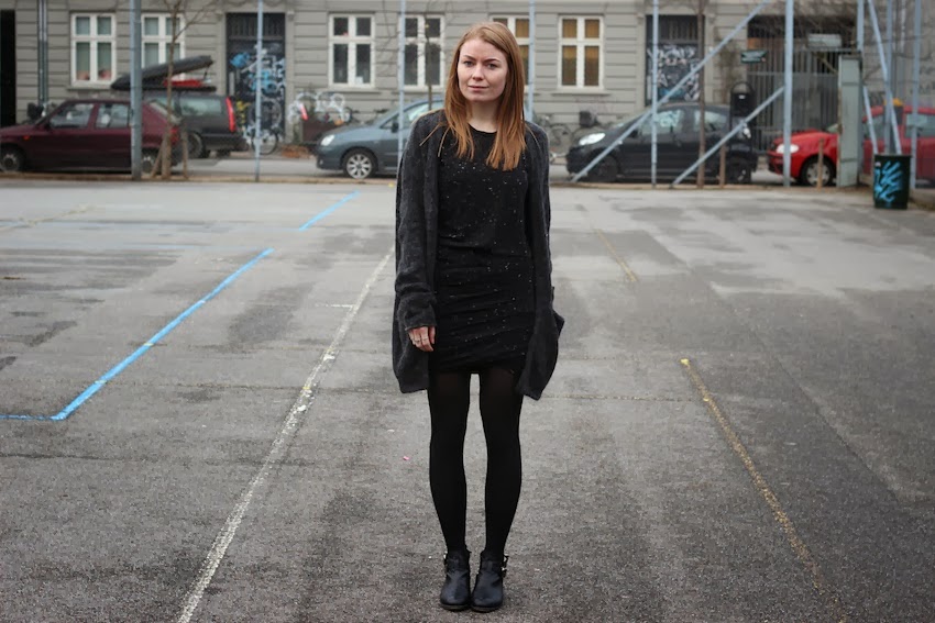 H&M; mohair knit / Moss Copenhagen dress / Dear Denier tights / Pavement boots