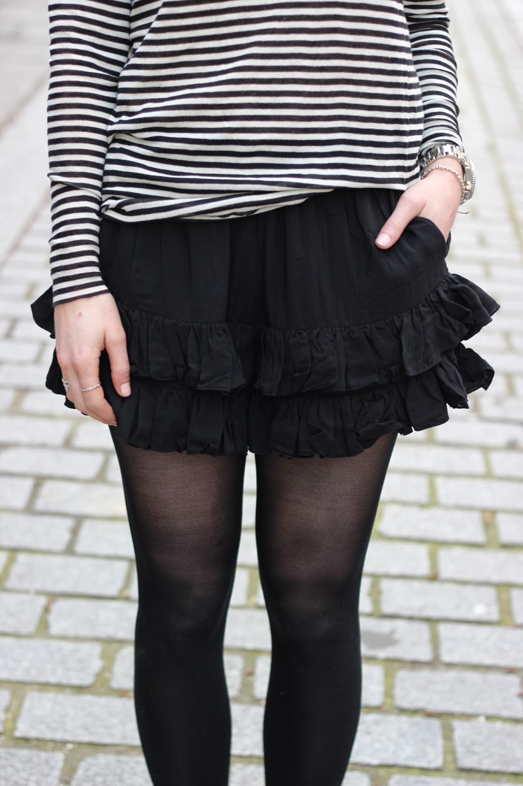 H&M; launchede jo deres meget omtalte Spring Collection igår, og mens store dele af kollektionen allerede er udsolgt i DK, så er der masser tilbage her i Paris. Dét måtte udnyttes, så udover den stribede bluse, så forelskede jeg mig også hovedkuls i denne flæse shortsnederdel, og med hjem måtte den.